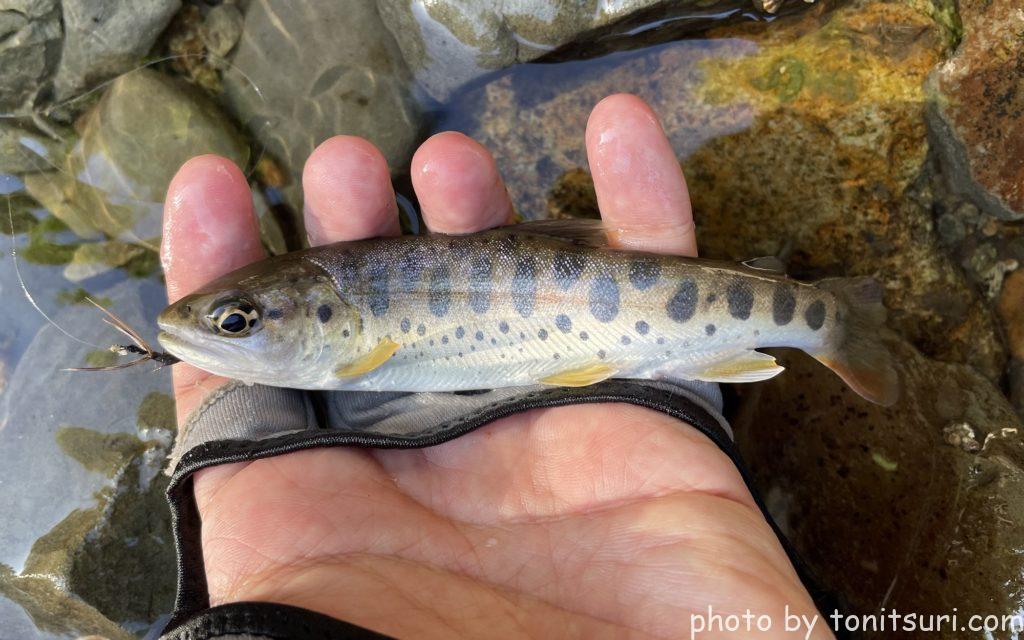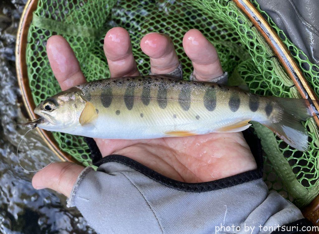 ちょっとサイズアップしたヤマメをキャッチしました。
