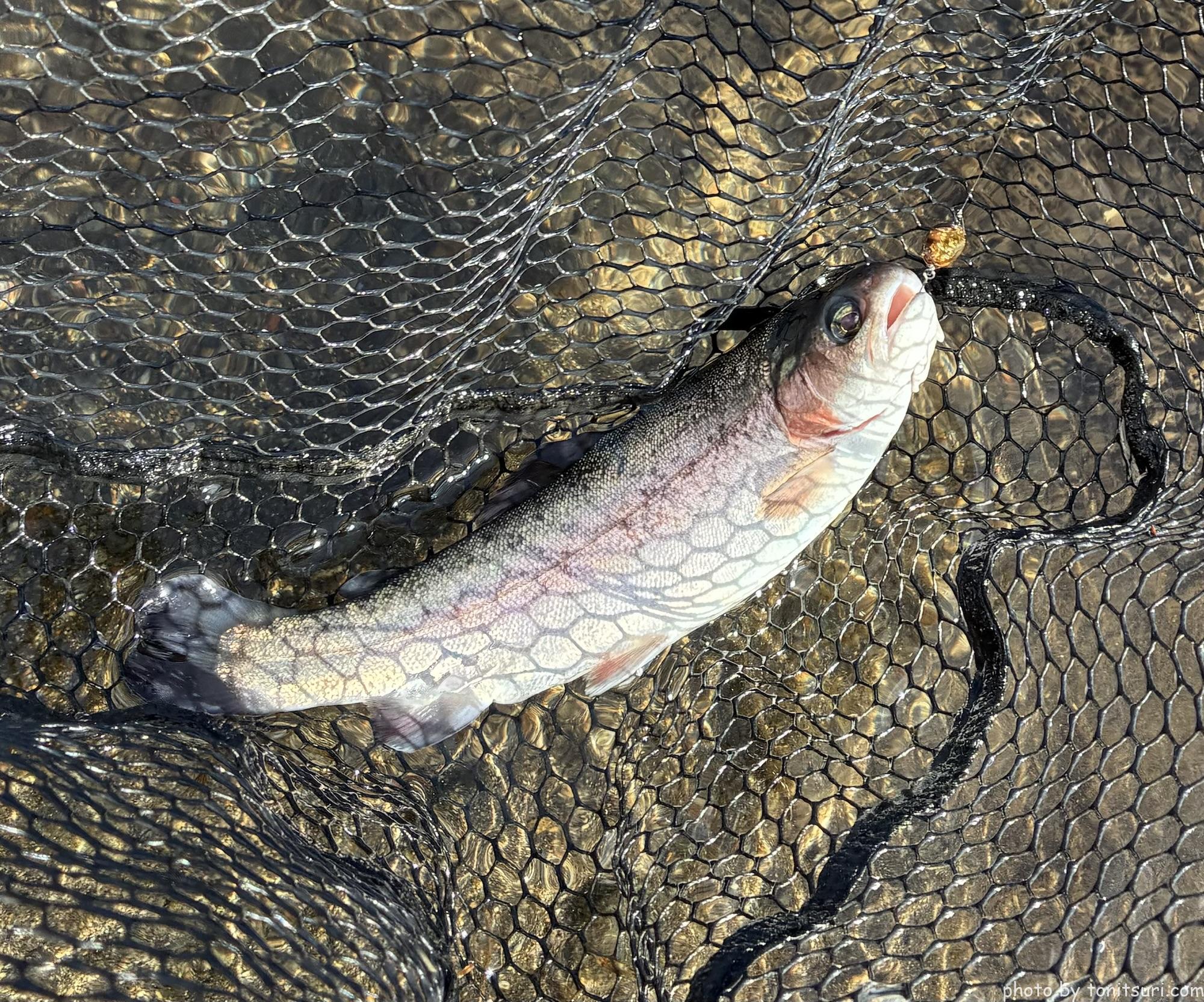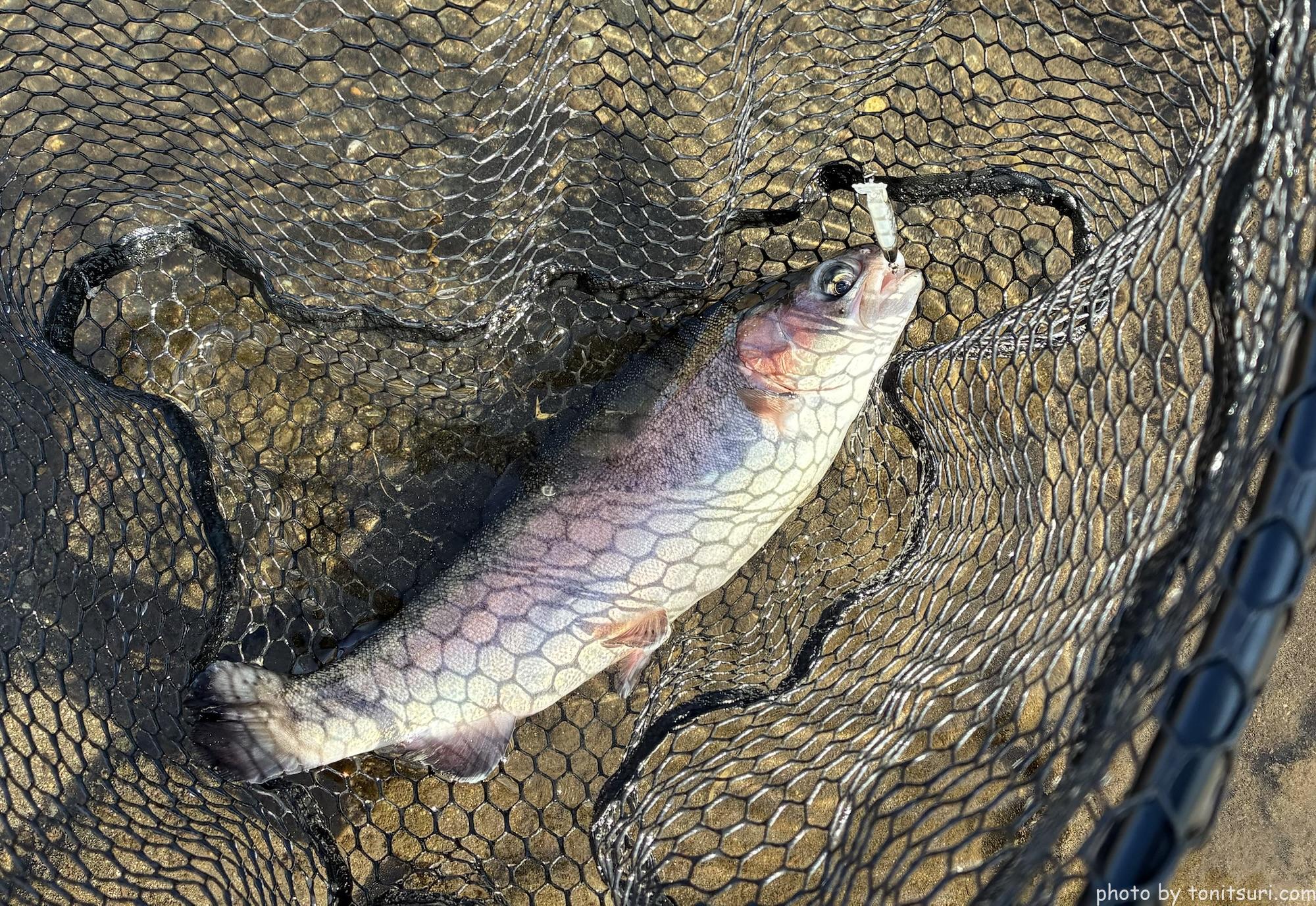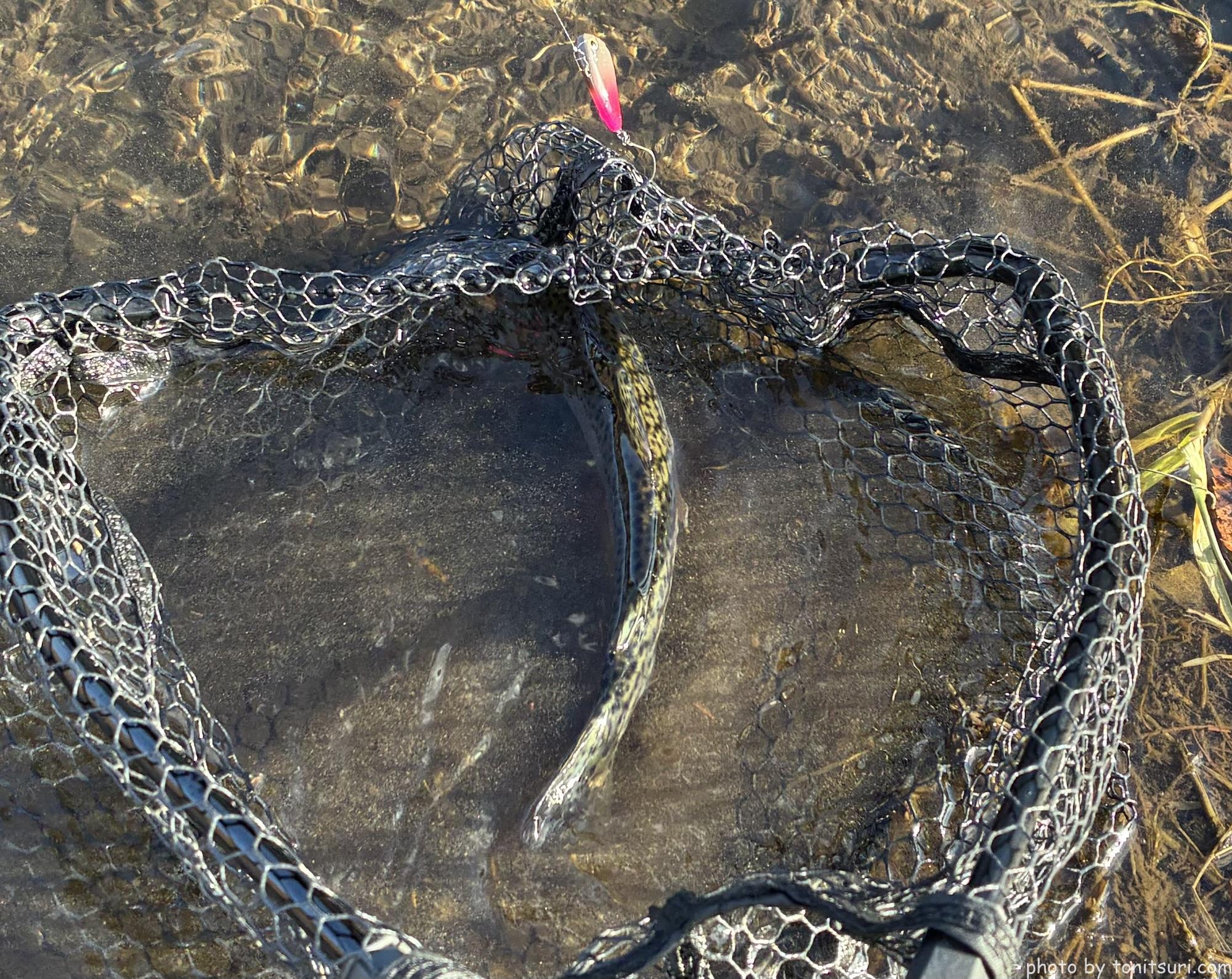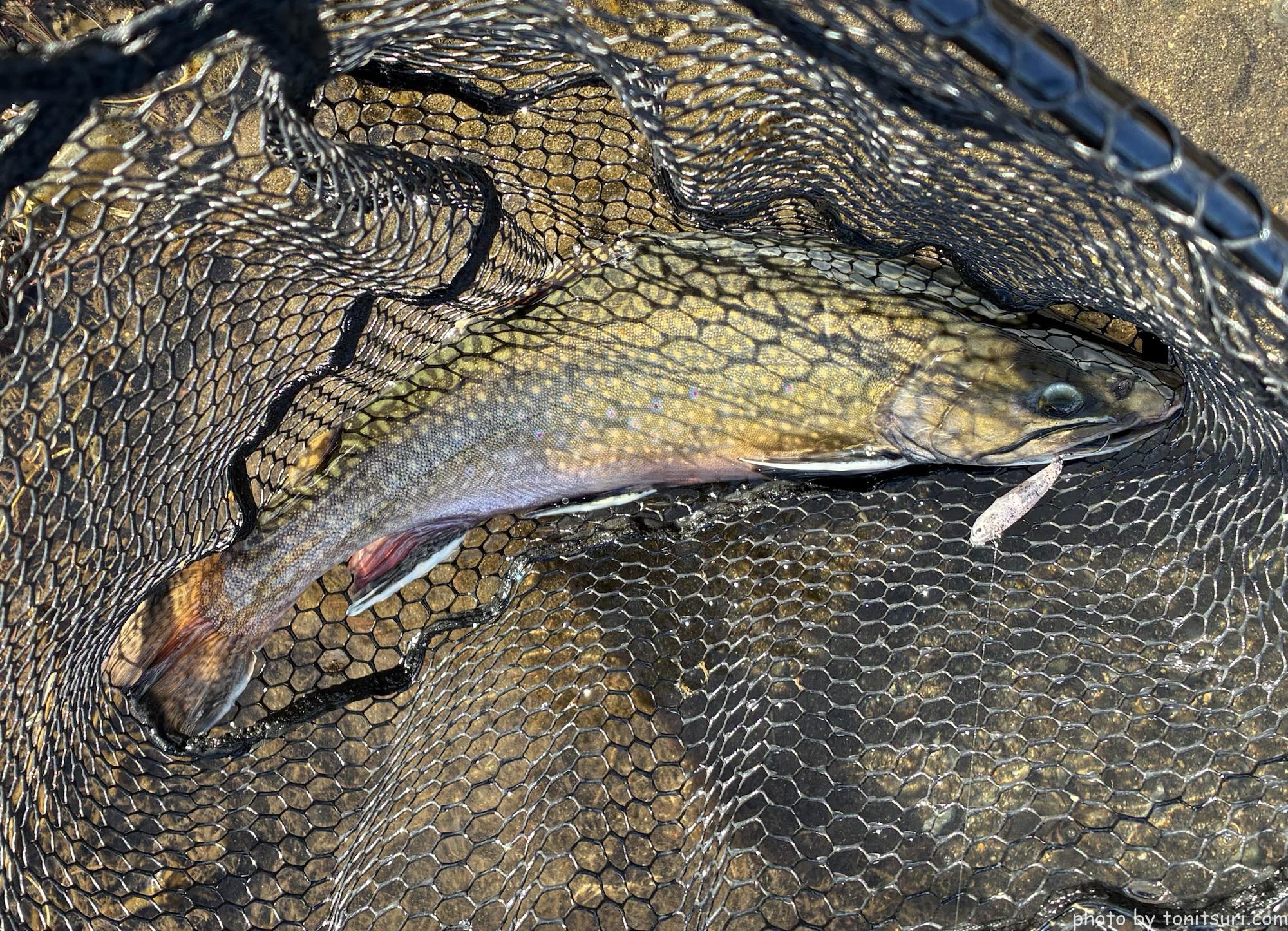 一応ボトムも試してみよう、と ちびダートランで良型ブルックをキャッチ!